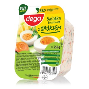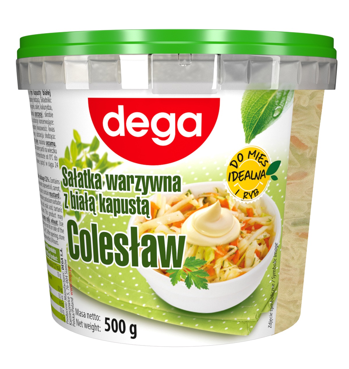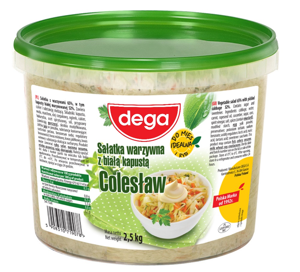 Sałatka z warzywami 69 %, w tym kapusty białej marynowanej 52 %. Główne składniki: kapusta, olej rzepakowy, woda, marchew, ogórek, cukier, kukurydza, ocet spirytusowy, sól, przyprawy (zawierają gorczycę), skrobia modyfikowana, śmietana w proszku (z mleka), żółtko jaja w proszku, ekstrakt kopru, substancje konserwujące: sorbinian potasu, benzoesan sodu; regulatory kwasowości: kwas mlekowy, kwas jabłkowy, kwas winowy (L (+) -); aromaty.