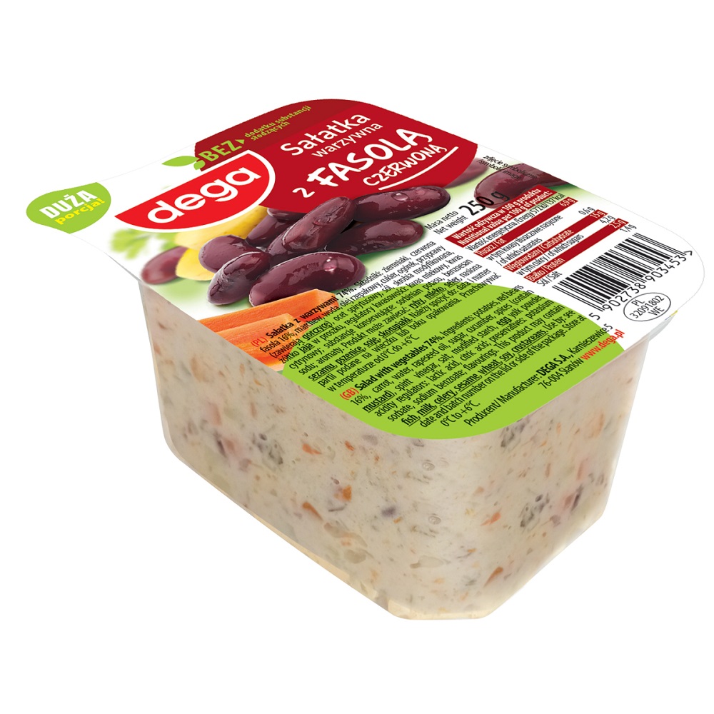 Sałatka z warzywami 71 %. Główne składniki: ziemniaki, fasola 18 %, marchew, olej rzepakowy, woda, ogórek, cukier, przyprawy (zawierają gorczycę), sól, ocet spirytusowy, skrobia modyfikowana, śmietana w proszku (z mleka); żółtko jaja w proszku, regulatory kwasowości: kwas mlekowy, kwas cytrynowy; substancje konserwujące: sorbinian potasu, benzoesan sodu; ekstrakt kopru, aromaty.